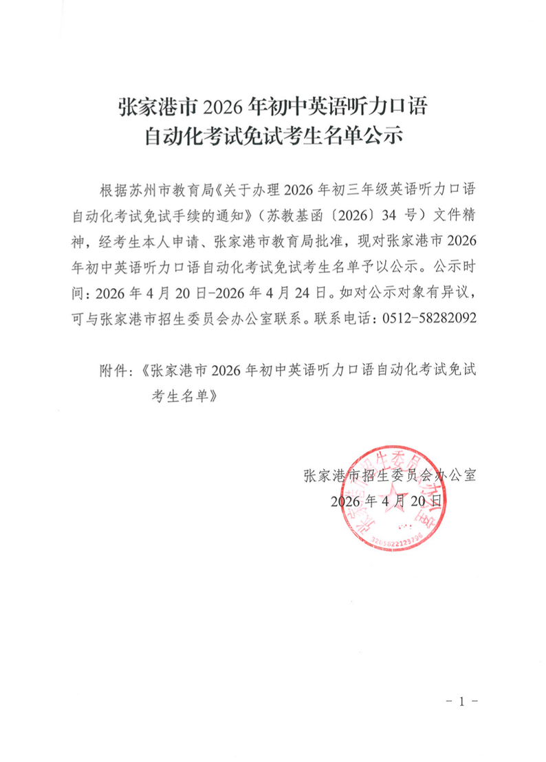 张家港市2026年初中英语听力口语自动化考试免试考生名单公示