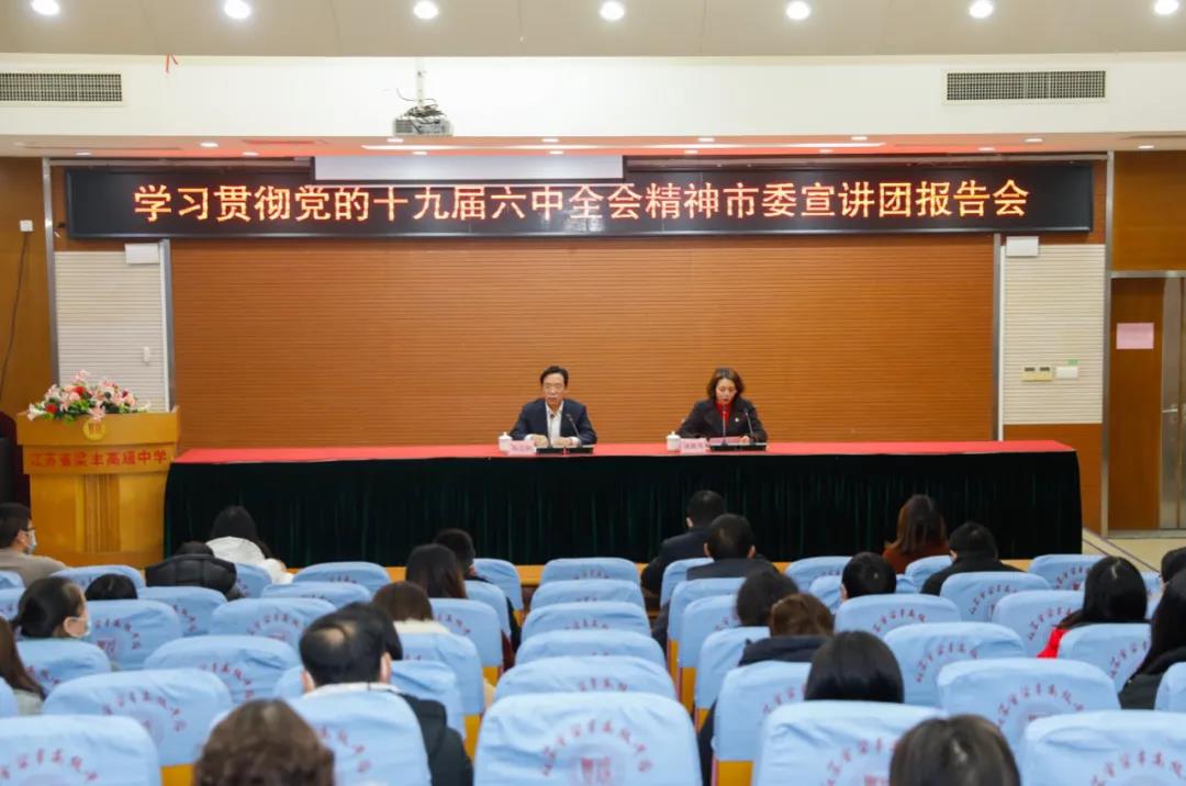 1月10日,学习贯彻党的十九届六中全会精神市委宣讲团报告会学校专场在梁丰高级中学举行,市委宣讲团成员,市委教育工委书记、市教育局局长杨志刚作宣讲报告,会议由梁丰高级中学党委书记、校长谈雅琴主持。