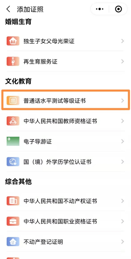 步骤2:在“文化教育”选择“普通话水平测试等级证书”。