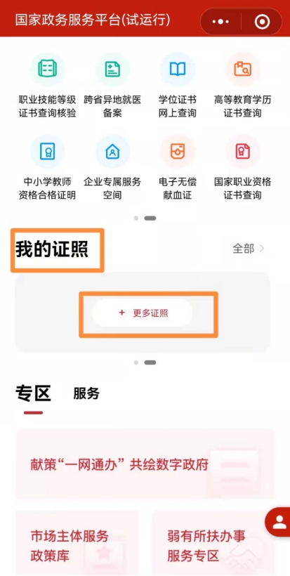 步骤1:在“我的证照”,点击“更多证照”。