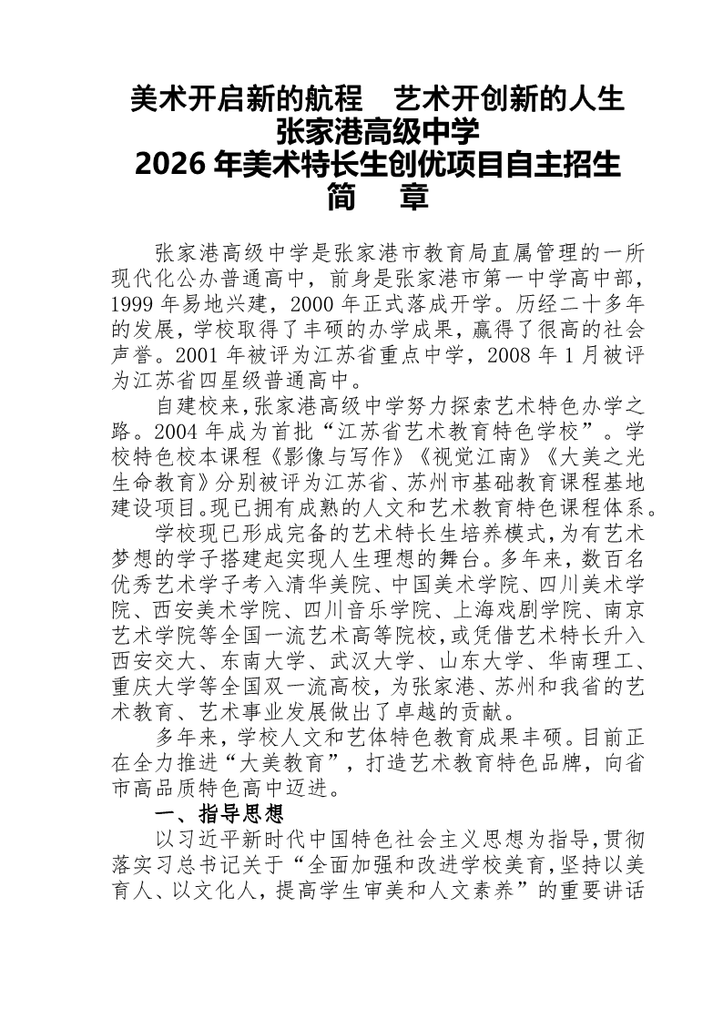 张家港高级中学2026年美术创优项目自主招生简章